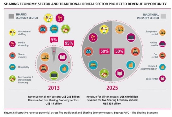 附注:上图将左侧五个新的“共享经济”部门(点对点融资、在线人员配置、点对点住宿、共享出行和音乐流媒体)的收入潜力跟右侧五个传统“租赁”行业的潜力进行了比较(设备租赁、住宿、汽车租赁、书籍租赁和网络媒体)