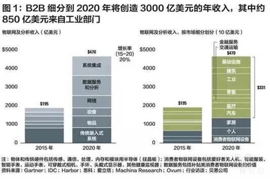 互联网消费电子设备和可穿戴设备已然赢得媒体关注,但企业和工业部门才将是物联网(IoT)的最大战场。到2020年,消费者物联网将创造1500多亿美元的收入,而B2B物联网则会在该基础上翻一番,预期收入将超过3000亿美元(图1)。我们估算在全球范围内,由于对物联网的热情高涨,各大供应商斥资800多亿美元展开并购,另有300多亿美元的创业投资。