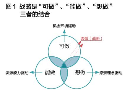 在某种程度上,战略(“该做”)是“可做”、“能做”、“想做”三者的结合。“可做”取决于外部环境,“能做”取决于资源和能力,“想做”取决于使命和愿景。“可做”、“能做”、“想做”的交集即为战略,如图1所示。