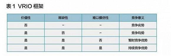 该框架认为,资源(包括能力)的价值性、稀缺性、难以模仿性是企业竞争优势的来源,它们与竞争优势的关系可以用表1清晰地表示。