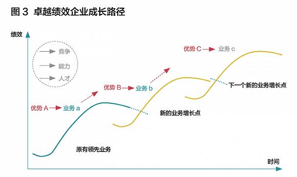 笔者认为,一个企业要实现持续发展,就要不断寻找属于自己的第二曲线、第三曲线(如图3),而新的成长曲线不会凭空产生,支撑它的是一个又一个竞争优势,也就是竞争优势集合。