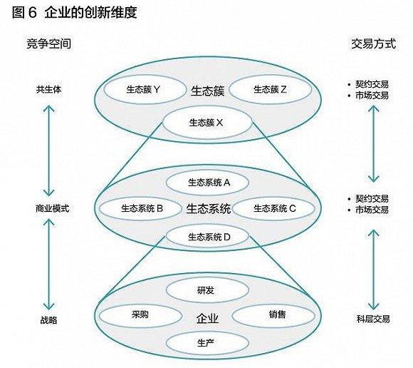笔者认为,企业的创新维度可以用图6来表示,企业、生态系统和生态簇三者的区别是:企业是内部利益相关者的聚合体,生态系统是内外部利益相关者的聚合体,生态簇是生态系统的聚合体,在竞争(创新)空间上分别对应战略、商业模式和共生体(魏炜、朱武祥、张振广,2017)。
