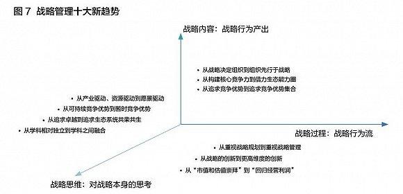 如同任何物体都有长、宽、高三个维度一样,战略也可以区分成三个维度:内容、过程和思维。上述战略管理的十大新趋势,可以放进内容、过程和思维三个维度之中(如图7)。