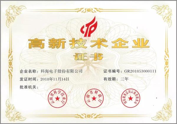 2019年1月21日,科海电子股份有限公司荣获由云南省科学技术厅、云南省财政厅、云南省国家税务局、云南省地方税务局联合颁发的高新技术企业证书及牌匾。这是公司自2012年首次通过认定后第三次被认定为高新技术企业,进一步推动着公司自主创新、自主研发的进程,同时也是公司发展历程中的又一个里程碑。