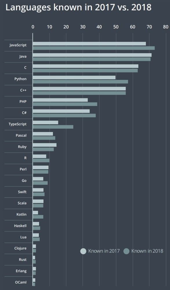 HackerRank询问开发人员他们知道哪些编程语言以及他们想要学习哪些编程语言。73%的开发人员表示,他们精通JavaScript,而2017年这一比例为66%。