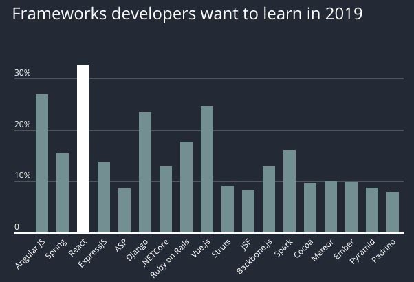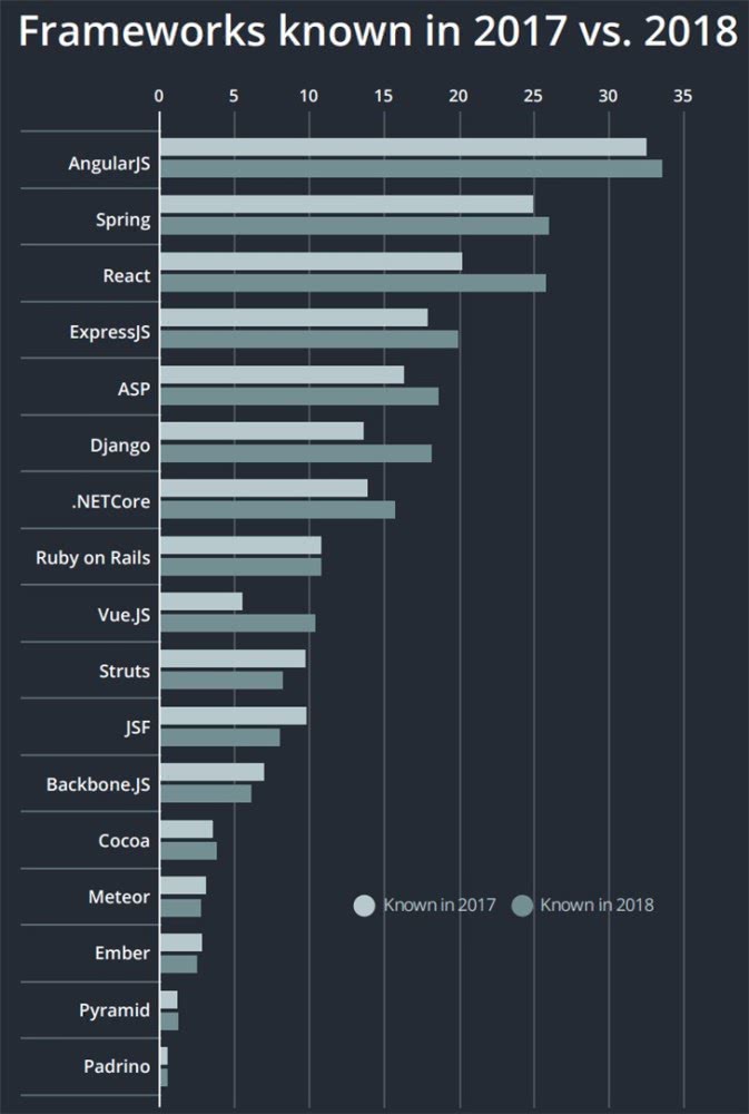 AngularJS仍然是开发人员最受欢迎的框架,但更多的开发人员已经开始学习React,了解React的开发人员比例从2017年的20%跃升至2018年的26%。这种趋势可能会持续下去,因为开发人员今年最想学习的架构也是React。此外,公司也最想要聘请懂React的开发人员。