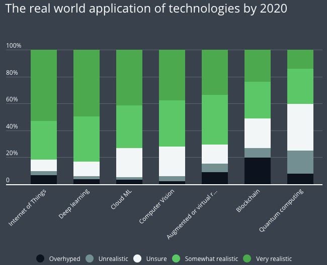 在实际应用中的新技术方面,53%的开发人员认为物联网(IoT)最有可能在未来两年内流行。