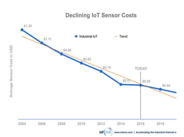 下图显示物联网传感器的价格,从今年到2018年已经下降了66%,这是今年值得关注的先进制造趋势之一。