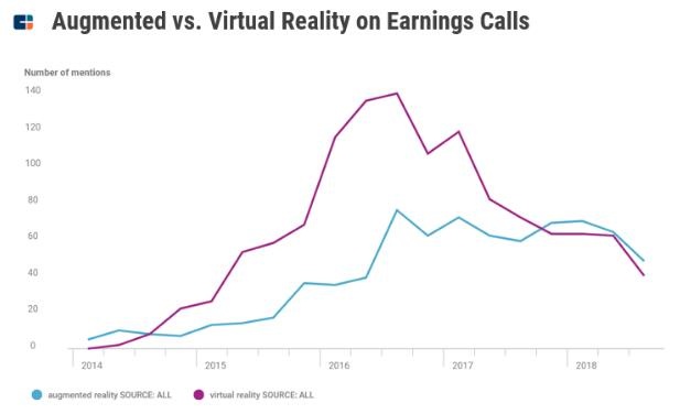 下图比较了AR和VR从2014年到2018年都不断上升的发展趋势。
