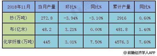 2018年前11月中国纱、布、化纤产量统计及增长情况