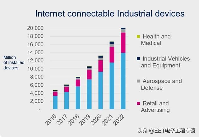 图1:2016~2022年可链接因特网工业装置统计(来源:IHS、意法半导体)