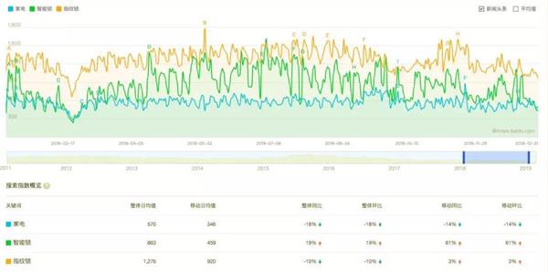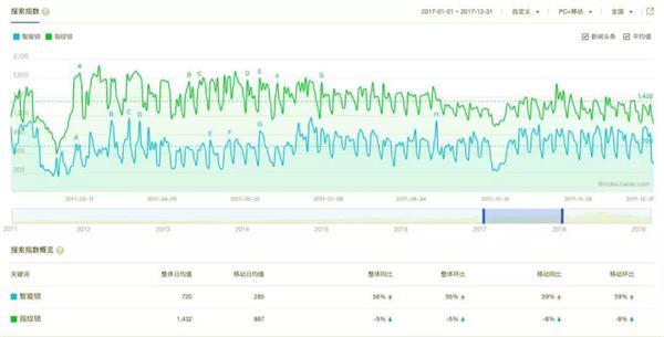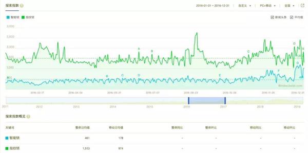 从2016年的数据来看,关键词“智能锁”在百度的整体日均搜索指数为461,移动端为178;“指纹锁”关键词在百度的整体日均指数为1513,移动端为974(见上图)。