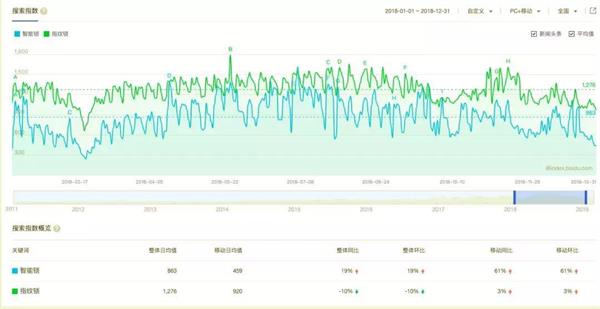 从2018年的数据来看,关键词“智能锁”在百度整体日均搜索指数为863,移动端为459,整体日均指数同比增长了19%,移动端日均值同比增长了61%;“指纹锁”关键词在百度整体日均搜索指数为1276,移动端为920(见上图),整体日均值同比下跌了10%,移动端同比增长了3%。