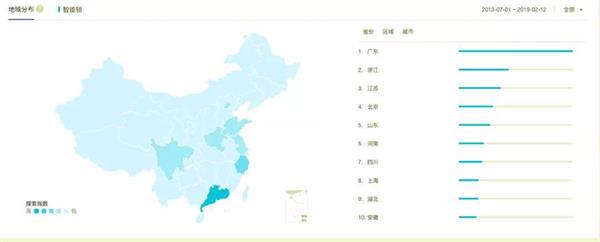 从百度指数2013年7月1日到2019年2月12日的数据来看,搜索指数最高的前十个省市(见上图)分别为:广东、浙江、江苏、北京、山东、河南、四川、上海、湖北和安徽。