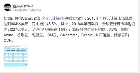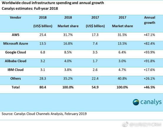 从国际调查机构Canalys最新发布的数据报告显示来看,在2018年全球云计算市场中,虽然依旧还是美国科技巨头亚马逊和微软以及谷歌排行在了前三。但在前五中已经发生了很大的变化,中国企业阿里巴巴的阿里云进入了前五,并且排行在了第四,市场份额已经超过了IBM,并且紧追谷歌,看来阿里云成功抗击国际四巨头,并且取得了很好的成绩。