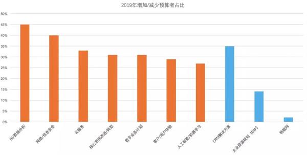 以下是2019年科技投资增加或减少的受访CIO的比例,橙色是准备增加投资,蓝色是准备减少投资。其中有7个领域在升温,有3个领域在冷却。
