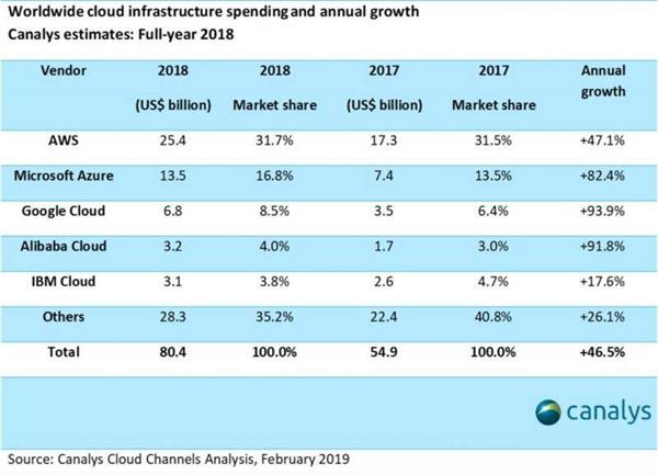Synergy Research Group 的数据显示,全球 Q4 云基础设施服务支出整体比上一年同期增长了 45 %,2018 年全年增长率为 48 %。根据 Canalys 发布的全球云基础设施支出和年增长率的数据显示,Google 不惜大刀阔斧抢占市场,2018 年 Google 云基础设施支出为 68 亿美元排名第三,但是年支出增长率最高远超亚马逊和微软。