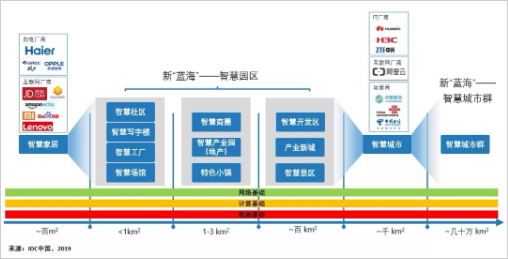同时,不同面积范畴的智慧空间新建设浪潮也“一日千里”。智慧园区是智慧城市建设的“细胞级”构建,包括智慧社区、共享办公、智慧商区、智慧场馆、智慧产业园区、智慧开发区、智慧景区等多种不同场景。建设主体以企业为主导,尤其以地产商和综合性集团为核心。从用户体验和商业变现两个角度进行智慧空间、智慧园区的打造。除政府主导的开发区以外,其他智慧园区皆以市场化模式运作,当商业模式验证后,其建设速度和推广力度都将远超传统智慧城市建设。IDC预测,到2020年,智慧园区市场的投资增速将远超智慧城市市场投资的增长速度。