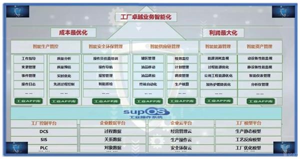 基于 SupOS工业操作系统强大的基础设施,智能工厂新架构提供平台开放服务,发展生态合作伙伴,打造全产业链工业企业 APP 库,实现工业数据生态圈。例如在石化行业,运行在 SupOS 工业操作系统上的工业APPs,如PID 控制回路自动调节、装置先进控制、全厂实时优化、外操智能巡检、生产计划排程、生产调度排产、物料平衡、智能报警管理、能源实时优化、设备智能监控、油品智能移动、油品调合、工厂仿真培训、罐区管理、终端智能自动化等,可达上千种。