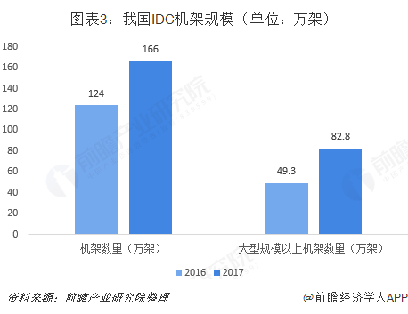 2013年以来,我国数据中心总体规模快速增长,到2017年底,我国在用数据中心机架总体规模达到166万架,总体数量达到1844个;规划在建数据中心规模107万架,数量463个。其中,大型以上(机架数超过500)数据中心是增长主力,大型以上数据中心机架数达82.8万,比2016年增长68%,数据中心总体规模占比近50%。