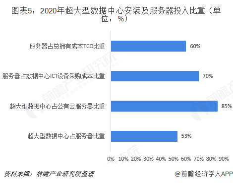 根据IDC全球云IT基础架构季度追踪报告预测,未来五年部署在云环境中的IT基础架构产品(服务器、企业存储和以太网交换机)总支出将不断增长。而目前服务器市场以企业用户为主,数据中心规模服务器集群约占30%,预计到2020年超大型数据中心将占服务器安装量的53%,占公有云服务器安装量的85%,数据中心的ICT设备采购成本中服务器约占70%以上,总拥有成本TCO中服务器相关成本占比约60%以上。