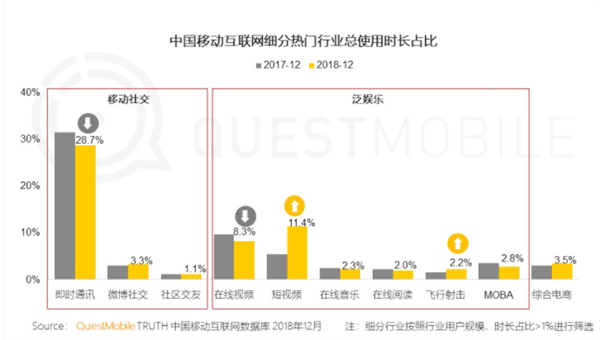 2018是短视频爆发元年,经过激烈的厮杀,美拍、秒拍等老势力退居二线,抖音、快手、好看视频、微视等新秀快速崛起,迅速占据了网民日常碎片化时间。据QuestMobile发布的最新数据显示,截至2018年12月,短视频正式超越在线视频,成为仅次于即时通讯的占据用户总时长的老二,没事看一看短视频已成为这个时代的网民的重要特征。