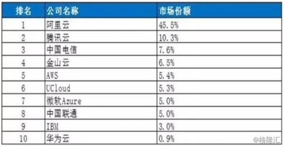 据市场调研机构IDC在2018年7月发布的《中国公有云服务市场半年度跟踪报告》显示,阿里云市场占有率达到了45.5%,腾讯云的市场占有率则是10.3%,运营商系的中国电信排名第3,市场占有率达到了7.6%。