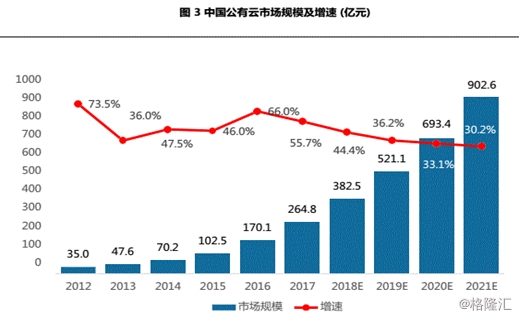 该份报告预计,在2018年-2021年中国公有云市场将继续保持高增速,到2021年市场规模将达到902.6亿元。