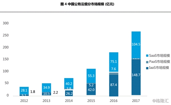 从细分领域来看,IaaS市场继续保持高速增长,PaaS市场增速超过预期。在2017年,IaaS市场规模达到148.7亿元,相比2016年增长70.1%;PaaS市场规模为11.6亿元,较去年增长52.6%;2017年SaaS市场规模达到104.5亿元,与2016年相比增长了39.1%。