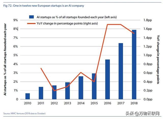 Kelnar表示,欧洲正在进入一个“人工智能创业时代”,每12个新创企业中就有一个将人工智能(A.I.)纳入其运营的核心。 而在2013年,该调查发现,50家新创企业中只有一家接受了人工智能。