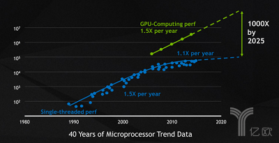 摩尔定律的正确性保持了30年,因为当时微处理器的性能每年会提升50%。但是,半导体物理学的限制意味着如今CPU性能每年只能提升10%。当前,NVIDIA GPU计算已为行业开启崭新的道路,到2025年,计算性能将提升至现有水平的1000倍。
