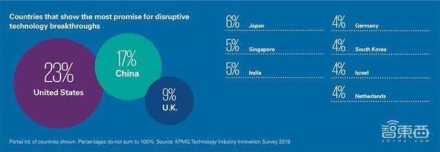 根据排名中我们发现,美国和中国在预计将产生最具颠覆性技术的国家的调查排名中保持前两位(23%与17%)。然而,美国的领先优势比去年稍微缩小了一点,当时美国与中国之间有8%的差异,今年缩小到了6%。