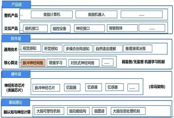 类脑智能技术体系分四层:基础理论层、硬件层、软件层、产品层。基础理论层基于脑认知与神经计算,主要从生物医学角度研究大脑可塑性机制、脑功能结构、脑图谱等大脑信息处理机制研究;硬件层主要是实现类脑功能的神经形态芯片,也就是非冯诺依曼架构的类脑芯片,如脉冲神经网络芯片、忆阻器、忆容器、忆感器等;软件层包含核心算法和通用技术,核心算法主要是弱监督学习和无监督学习机器学习机制,如脉冲神经网络、增强学习、对抗神经网络等;通用技术主要是包含视觉感知、听觉感知、多模态融合感知、自然语言理解、推理决策等;产品层主要包含交互产品和整机产品,交互产品包含脑机接口、脑控设备、神经接口、智能假体等,整机产品主要有类脑计算机、类脑机器人等。