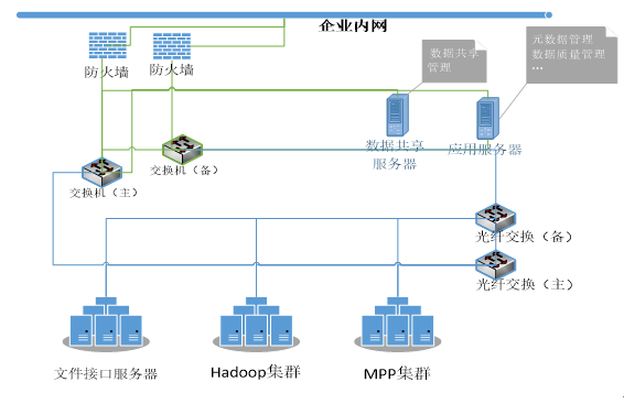 硬件组成:文件接口服务器、应用服务器、数据共享服务器和Hadoop/MPP数据库集群服务器(如图1所示)。