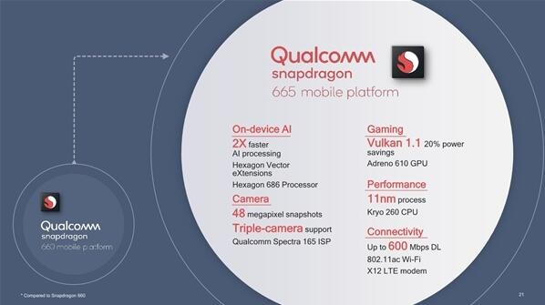 骁龙665则为骁龙660的升级版,采用11nm LPP工艺制造,这款八核心芯片采用4×Kryo 260(A73)+4×Kryo 260(A53),GPU 升级为Adreno 610,支持Vulkan 1.1,可节省20%功耗;此外升级的Heagon 686 DSP、Spectra 165 ISP,支持最高4800万像素单摄,并支持三摄,同时高通还宣称其AI性能快了两倍。S665搭载的是X12 LTE modem,传输速度最快600Mbps,同时也支持MU-MIMO 802.11ac Wi-Fi。