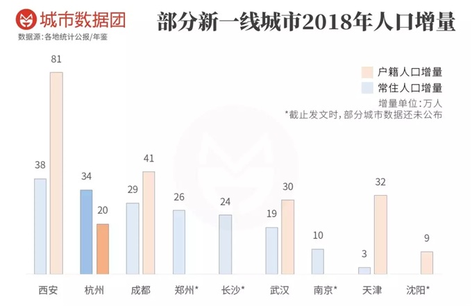 各新一线城市2018年人口增量数据来源于各市数据公报和年鉴。
