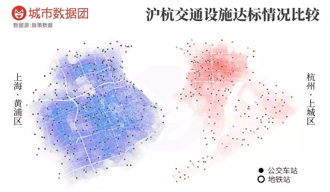 具体来看:杭州市中心只有68%的小区居民能在步行15分钟范围内找到地铁站和公交站,而上海市中心的比例是89%;而这种差异,又主要是因为杭州的地铁站数量较少造成的。目前,上海开通了16条地铁线,黄浦区境内有8条地铁线和18个站;而杭州开通了3条地铁线,上城区境内有2条地铁线和9个站。