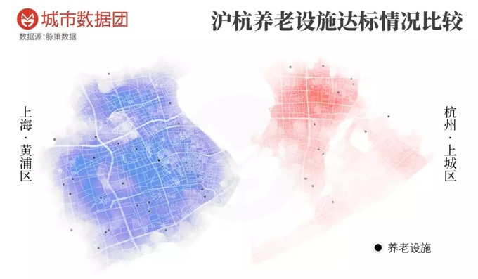 杭州市中心只有44%的小区住户能在步行15分钟范围内找到至少一个养老助老机构,而这个比例在上海市中心是78%。换个指标看就是,上城区养老助老机构的人均拥有量与黄浦区差不多,但地均密度只有黄浦区的一半。(上城区有约10万位60岁以上的老人和不到15个养老助老机构,黄浦区有约20万位老人和30多个养老助老机构。)