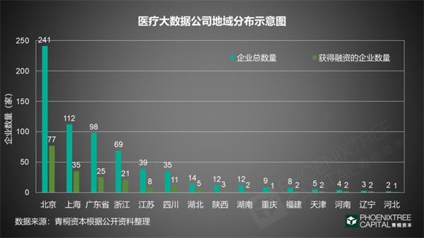 青桐资本对医疗大数据公司地域分布进行了研究,我们发现主要集中在北京、上海、广东、江苏、浙江等东部地区,究其原因主要是这些地区三级医院数量最多、优质医疗资源丰富且信息化程度高,企业能够获得高质量的数据样本。