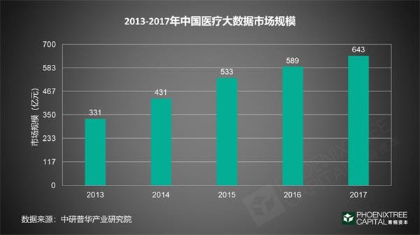 医疗大数据在近几年驶入快车道,行业增速逐年提升,市场规模更是不断突破。中研普华产业研究院数据显示,2017年我国医疗大数据市场规模达到643亿元,对比2013年331亿元,五年间复合增长率达20%。