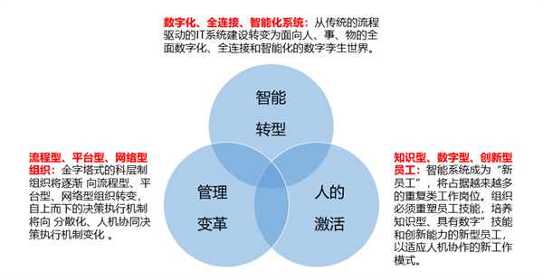 企业的数字化转型由三个要素构成,即智能化转型、管理变革、人的激活以及智慧组织。