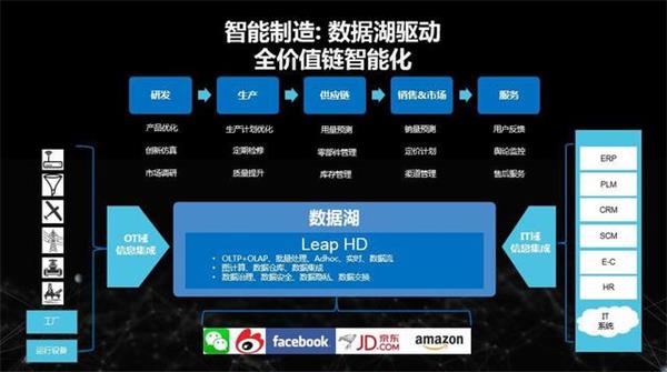大家可以看到,数据智能分析的基础是数据湖,包括IT域、OT域、以及其它渠道采集数据,清洗、储存,并提供数据治理、安全隐私等功能,从而提升从研发、生产制造、供应链、销售到服务的全价值链的运营效率。