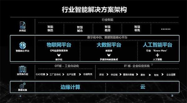 下面我从技术架构层面介绍行业智能,整体架构主要分为四层,首先是基础架构,包括边缘计算和云,边缘计算将变得越来越重要;上面是OT和IT系统组成的业务执行层;再往上智能平台,包括物联网平台、大数据平台和人工智能平台;最上面是应用层,是行业和技术的接口。