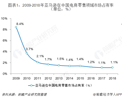 2009年,亚马逊在中国电商市场占有率为8.4%。2014年,阿里巴巴和京东赴美上市,两者当时分别占据电商市场份额的46.3%和14.4%,而亚马逊仅占1.4%。截至2018年,亚马逊在中国电商市场的份额进一步下降至1.1%,可以说亚马逊在中国电商市场的竞争中节节败退。