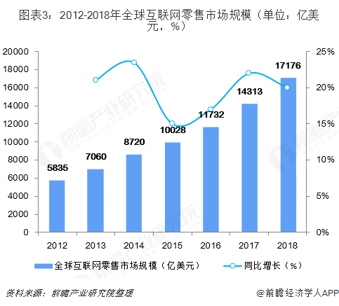据Euromonitor统计数据,2012年来全球互联网零售市场快速发展,年增速基本保持在15%以上。2018年全球互联网零售市场规模为17176亿美元,同比增长20%。