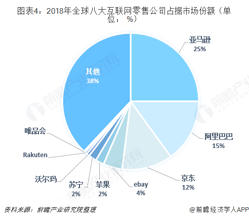 据Euromonitor统计数据,2018年,全球电商零售市场呈现寡头垄断竞争格局,亚马逊作为全球最大电商巨头,占据了25%的互联网零售市场份额,阿里巴巴和京东分别占15%和12%,前三名市场份额合计占比高达52%,较2017年提升了5个百分点,全球互联网零售呈现高度集中趋势。
