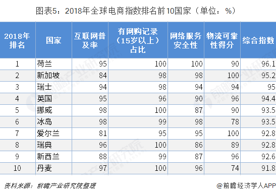 根据联合国发布的“2019全球B2C电商指数”排名报告。在全球电商指数排名中,排名前10位的国家中有8个位于欧洲,其中荷兰位居首位,紧随其后的是新加坡和瑞士。排名前十均为发达国家。