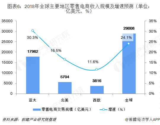 根据《2018全球电商行业蓝皮书》数据,2017年亚太地区的零售电商交易规模13797亿美元,2018年亚太地区零售电商销售规模预计达到1.8万亿美元,占全球零售电商收入的62%,且增速依然保持最高,超过30%。其次是成熟市场北美及西欧;而新兴市场中欧东欧及中东非洲增速则较快,将超过20%。