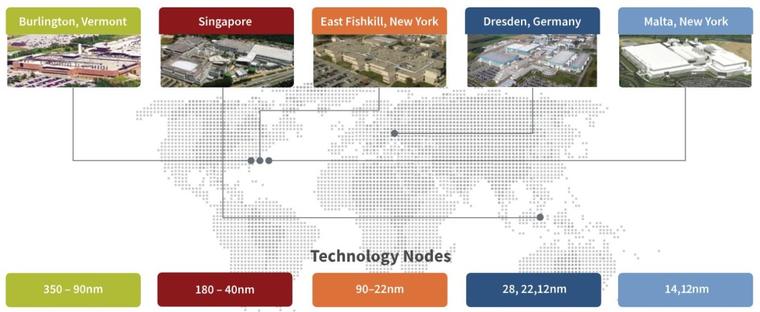 格芯原先分别有五间8英寸厂及五间12英寸厂,地理地点分散于美国佛蒙特州、纽约州(Fab 10已出售)、新加坡(Fab 3E已出售)、德国以及中国大陆(已经停工)。可以看到,格芯各厂区太过分散,要互相整合资源或是援助都很困难,供应商也不可能每一间都就近服务,衍生的人力、交通与物料成本都十分昂贵,必须就近服务才符合效益。