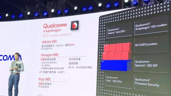 去年年底,高通正式发布全新骁龙855移动处理平台,集成了高通全新第四代多核人工智能引擎(AI Engine)技术,在CPU、GPU、ISP等方面,都带来了全新的AI运算能力,主要包括Hexagon 690处理器,Adreno 640 GPU和Kryo 485 CPU等。